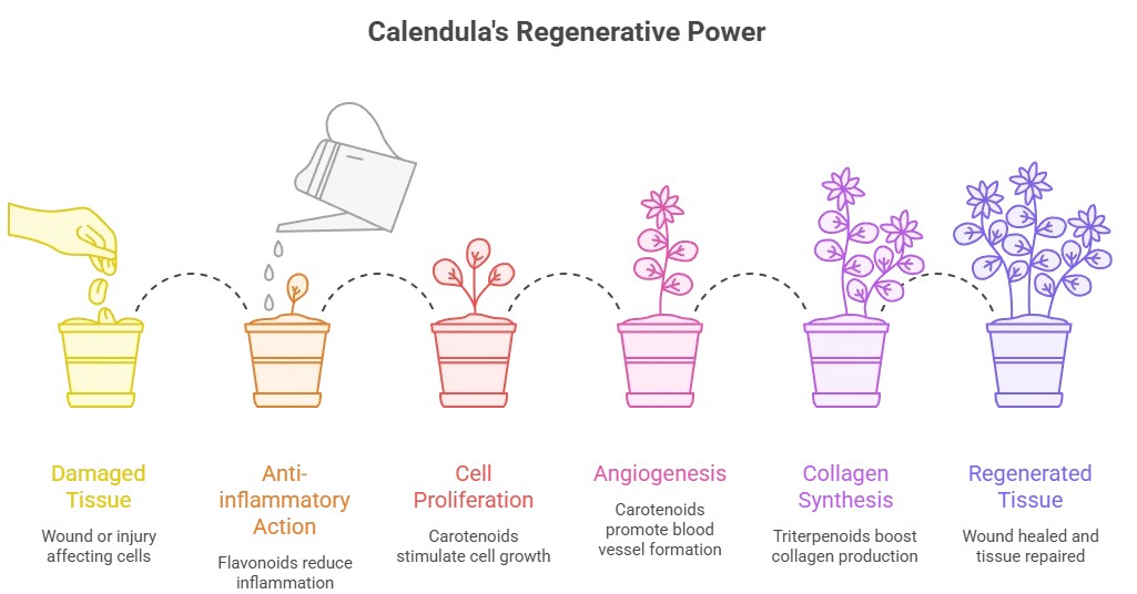 Calendula accelerates wound closure by stimulating cell proliferation, collagen synthesis, and angiogenesis. Its anti-inflammatory and antioxidant properties make it a popular choice in skincare.