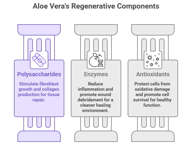 Aloe vera is a succulent renowned for its ability to promote wound healing and tissue repair. Its gel contains compounds that stimulate fibroblast proliferation, increase collagen synthesis, and accelerate new blood vessel formation—all essential for regeneration.